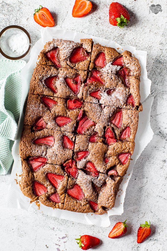 Pour everything into a baking dish (approx. 10 x 8 inches) lined with parchment paper, spread the mixture evenly over the bottom, and then arrange the halved strawberries over the entire surface, with the cut side facing up.