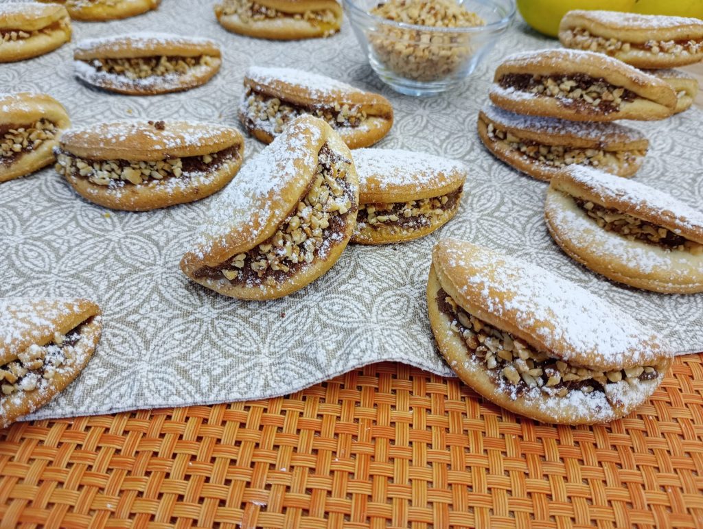 Soft and delicious. The baciati cookies are very beautiful to look at and very good to eat. They are very simple to prepare, made with a soft shortcrust pastry and a tasty filling, I opted for apricot jam and a spreadable hazelnut cream and finally decorated with chopped hazelnuts. Come with me, let’s start baking right away.