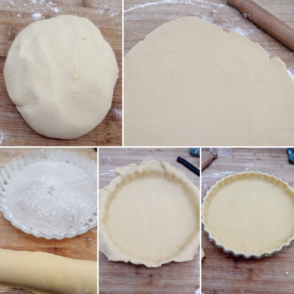 Take the tart pan with the shortcrust pastry already rolled out. Prick the bottom with a fork.