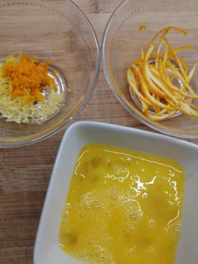 First, focus on the aromatic part: finely grate the zest of one orange and the zest of one lemon into a small bowl, being careful to get only the colored part. Then, take the orange and also create some thin strips (julienne) of its peel, trying to avoid as much as possible the underlying white part, which is bitter.