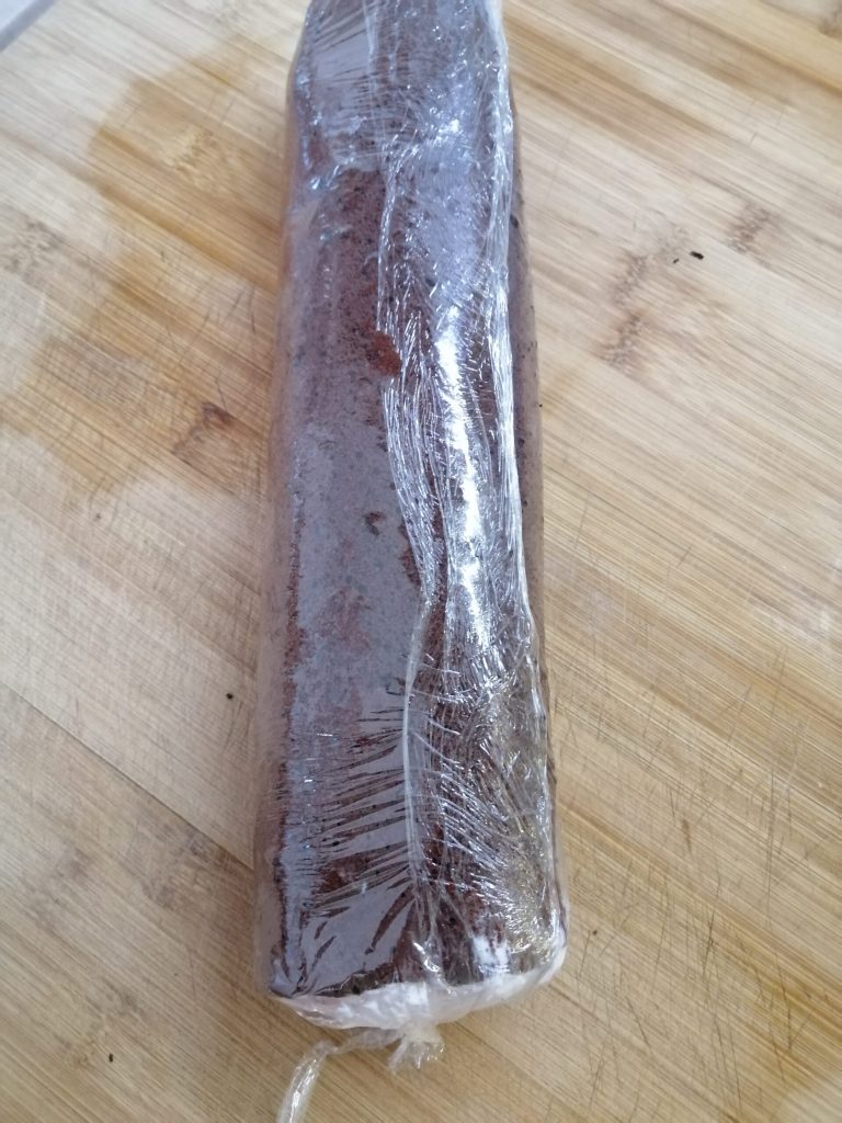 After resting in the fridge, remove the roll from the plastic wrap and generously sprinkle the surface with powdered sugar before serving.