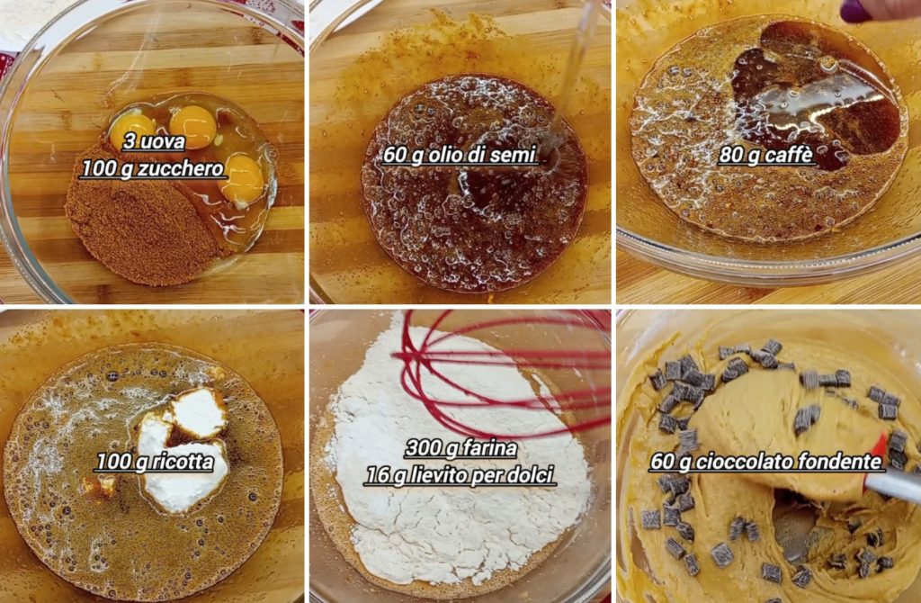 Using a hand whisk, beat the eggs and sugar. Then add the oil and warm coffee (not hot). Add the ricotta and mix well. Next, add the flour and baking powder sifted together. Mix well. The batter will be very thick, it is normal. Add the dark chocolate chips and mix.