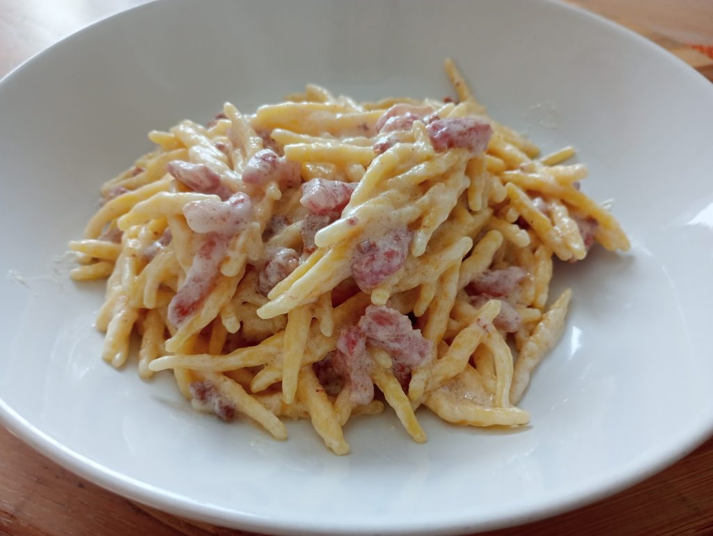 The creamy pasta with guanciale and robiola is ready to be devoured.