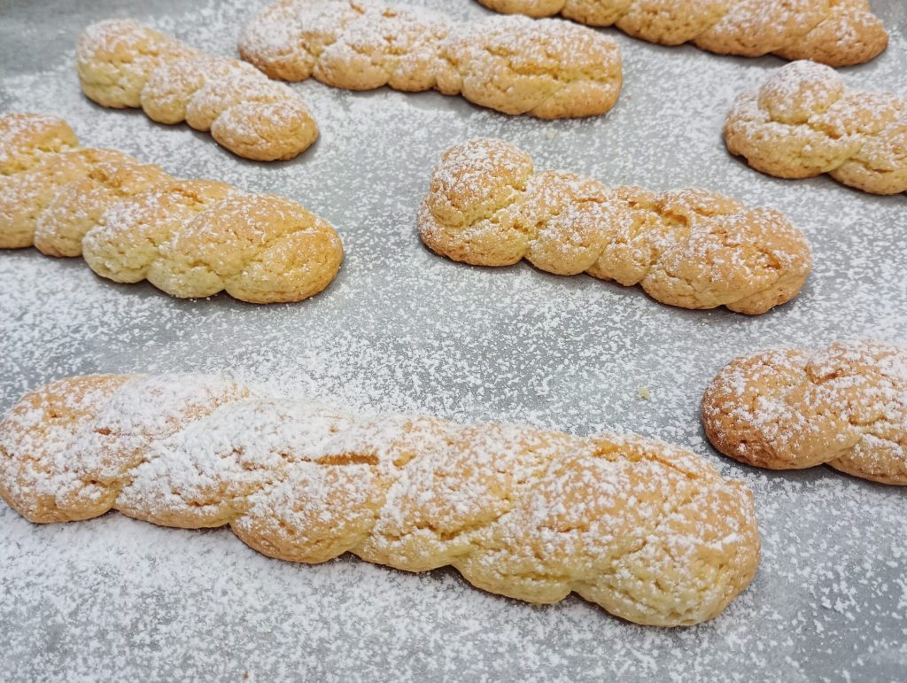 Once the strand is made, position it in a horseshoe shape and start twisting the two ends until closed. Place the twisted cookie on a baking sheet lined with baking paper.