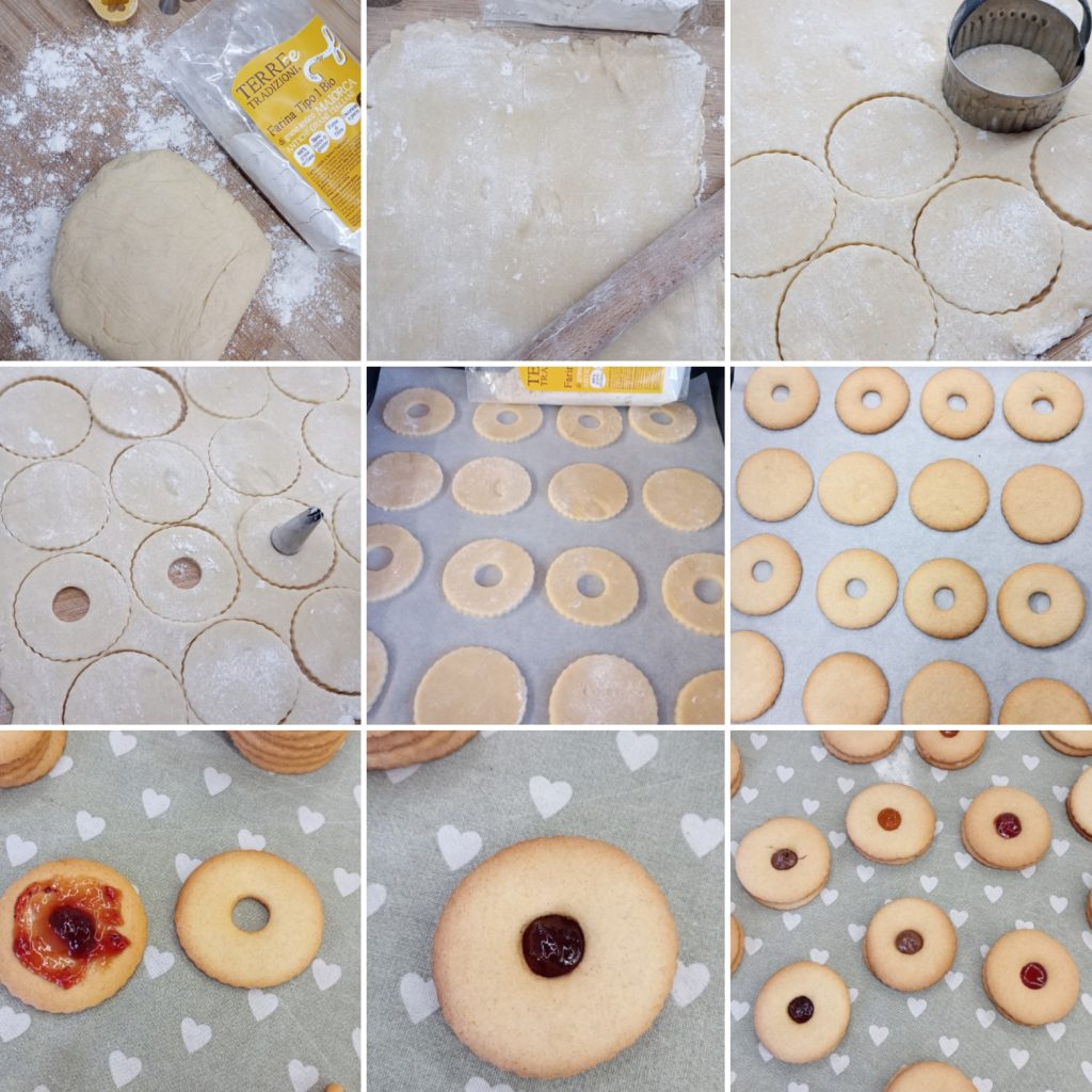 Only when they are cold, proceed to fill them: take the base of a whole cookie and spread a thin layer of jam or cream. Make a slightly more abundant mound in the center. Cover with the holed cookie and press gently.