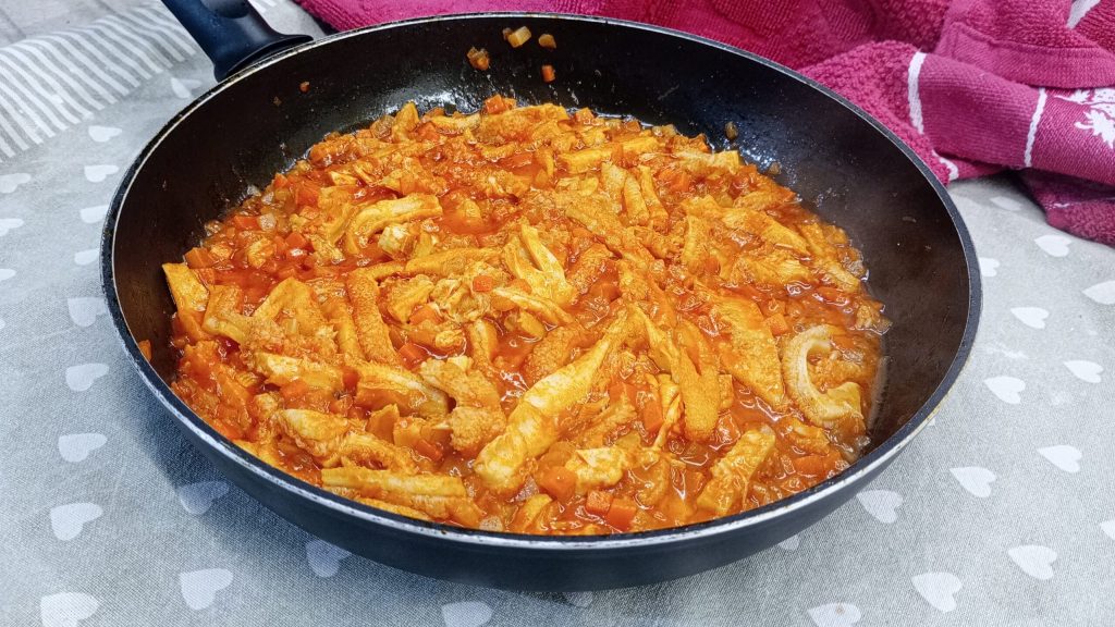 This recipe is perfect for those who love bold flavors but don’t have hours to spend in front of the stove. By using pre-cooked tripe, found in the supermarket’s refrigerated section, we drastically reduce preparation time without compromising on creaminess. The secret lies in the use of tomato paste, which envelops the meat and creates an irresistible sauce, perfect for the final “scarpetta”. It’s a humble dish from tradition, but rich in character and warmth.