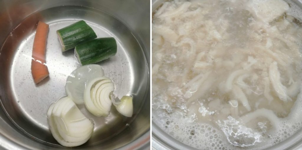 First, prepare the vegetable broth. I used what I had at home: a carrot, an onion, and a zucchini. Prepare about 1.7 cups: you’ll probably have some left over, but it’s better to have it ready just in case the tripe dries out too much during cooking.