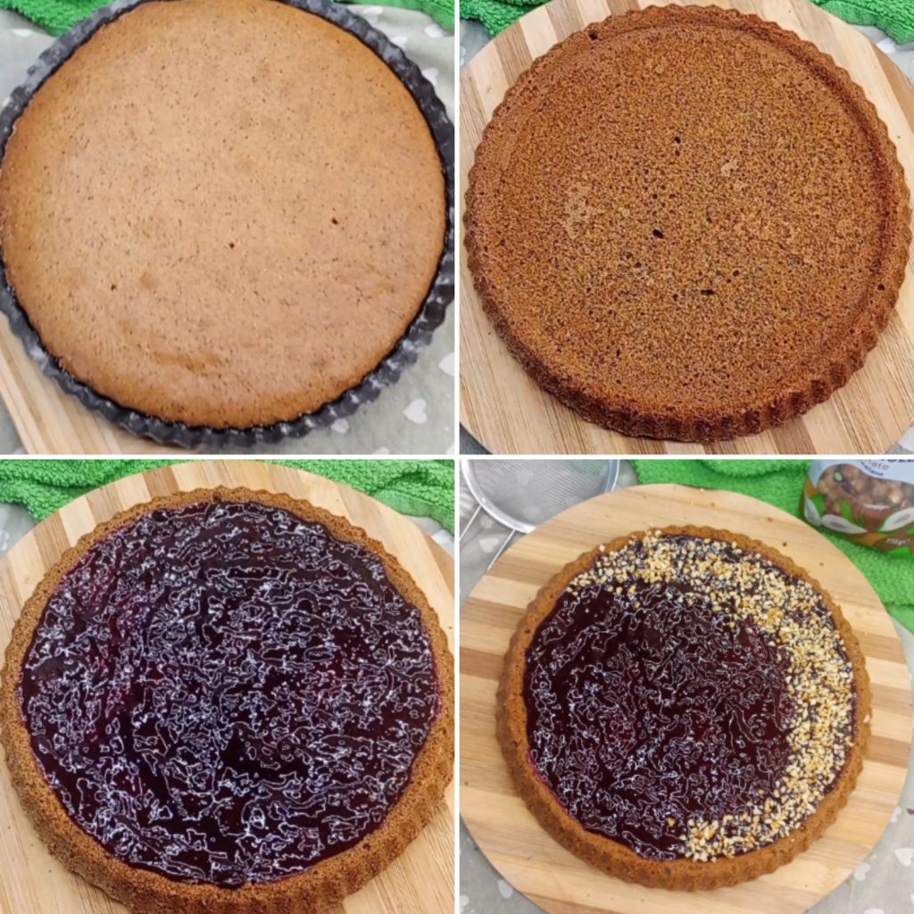 If you used the clever mold, turn it upside down and fill the top with jam; if instead you used a classic mold, cut it in half and fill it generously.I sprinkled the surface with hazelnut crumbs.