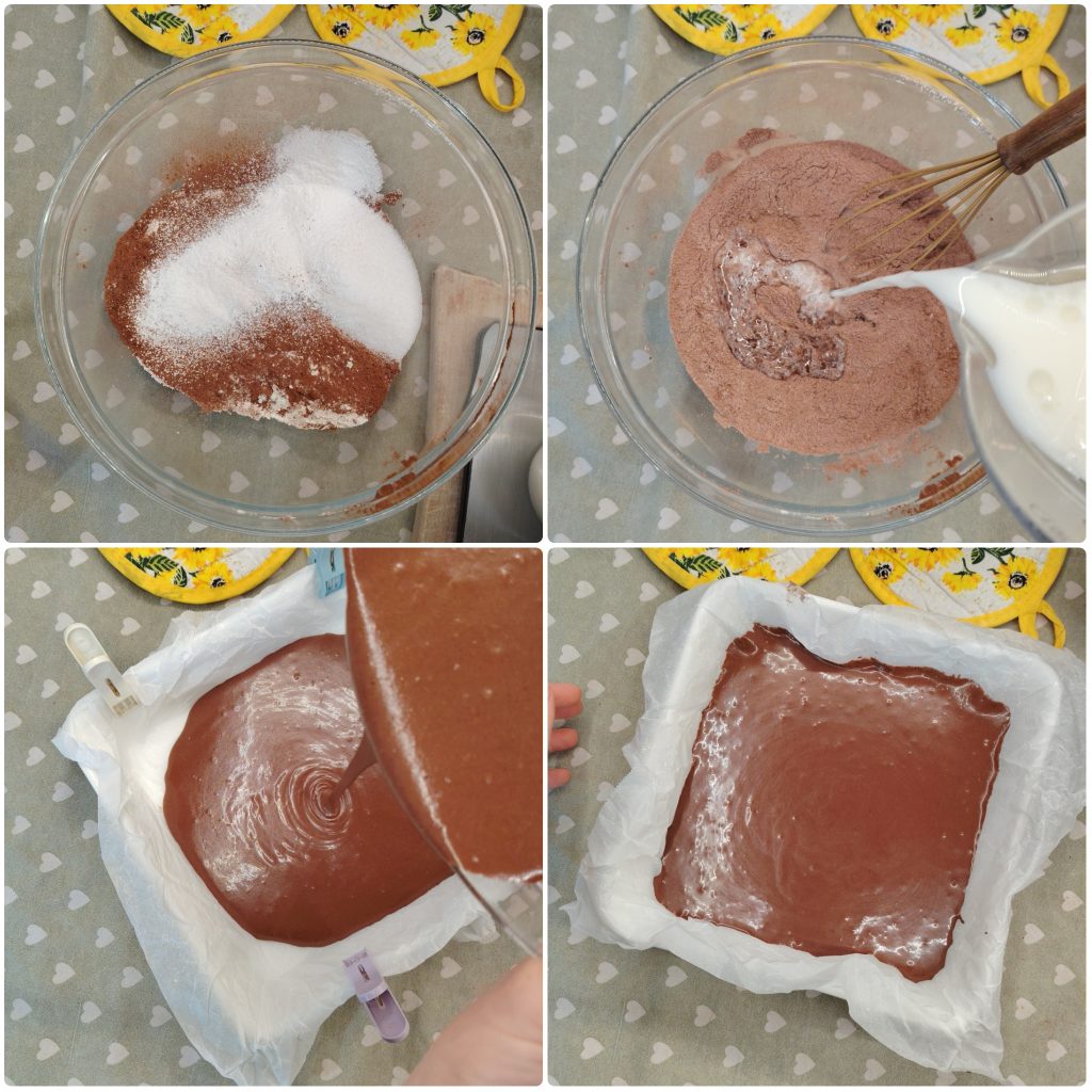 In a bowl, mix the flour, cocoa, sugar and baking powder. In a jug or a large glass, pour the milk, water and oil. Work these liquids together and then pour them in a thin stream into the dry ingredients, until you get a creamy and homogeneous batter.