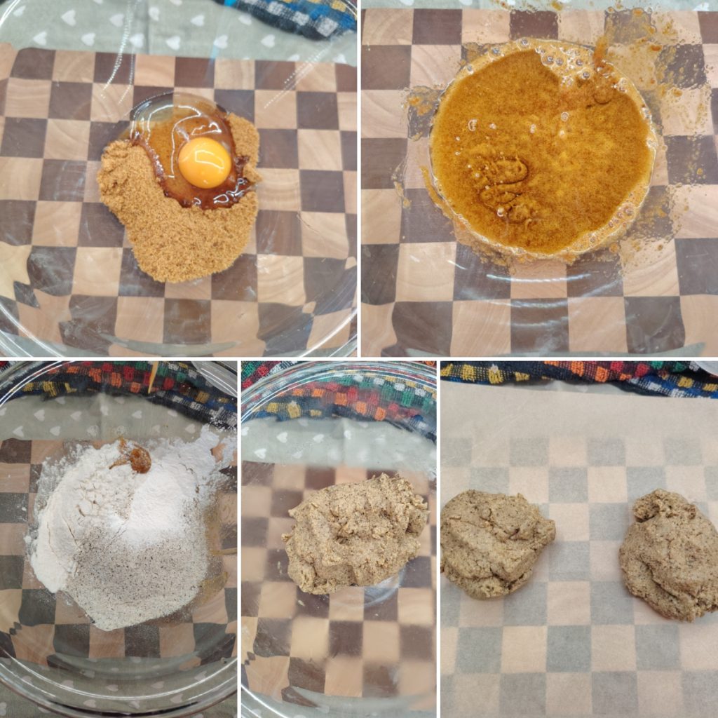 In a bowl, work the egg with the sugar, add the oil and then the flours with the baking powder. Mix quickly: the dough should not become too compact, but should remain a soft dough so it can be worked easily.