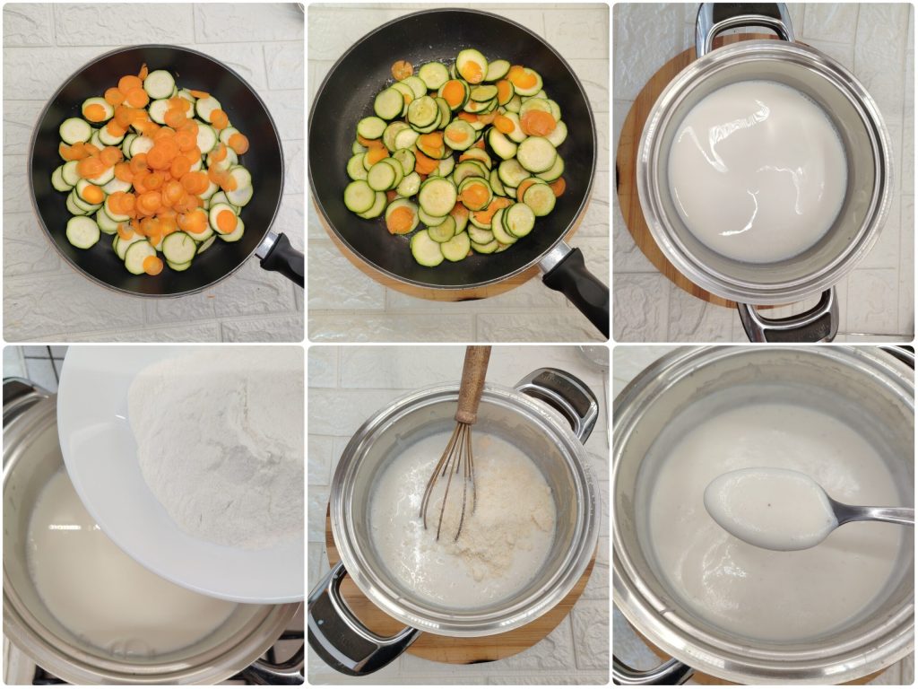 First of all, prepare the zucchini and the carrots. In a frying pan add a drizzle of olive oil and pour in the carrots and zucchini sliced into rounds. Sauté them for about 10 minutes. If necessary, add 1/2 cup of water and cook with the lid on so the steam helps them cook through.
