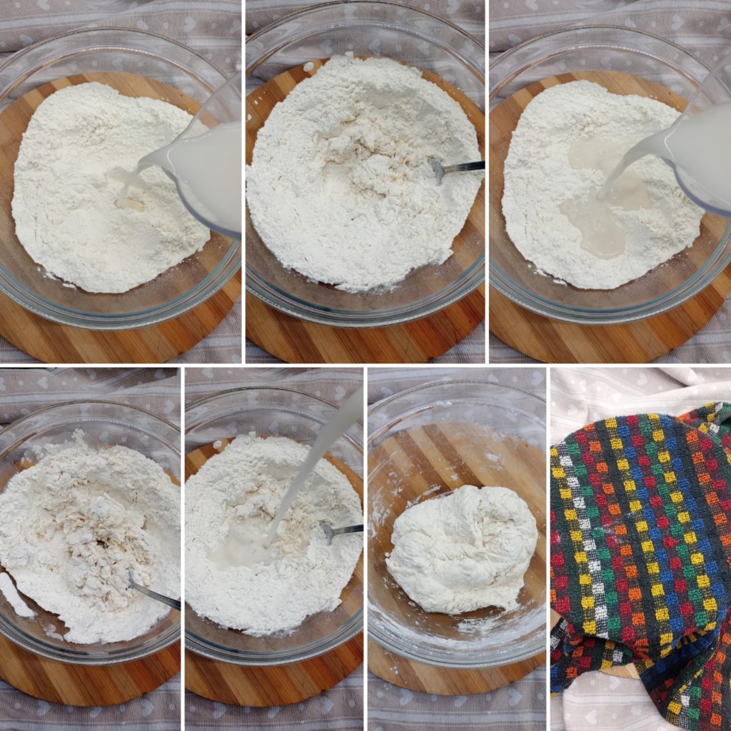 Continue working the mixture with the ladle, the dough should be smooth, soft, and sticky.Cover the bowl with a cloth and let it rest for 20 minutes.