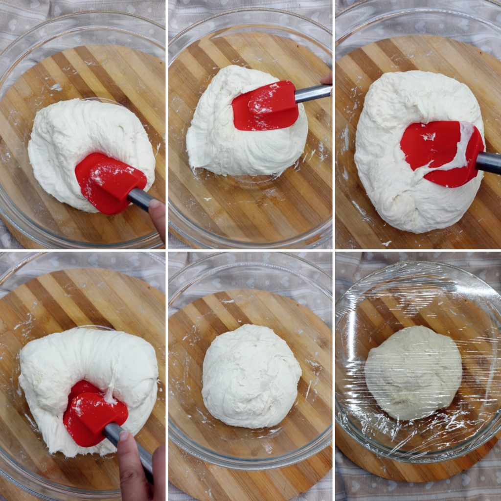 After the time has passed, make a series of folds directly in the bowl using the spatula: lift a flap of dough from the outside towards the center, rotate the bowl and repeat the operation from all sides until the dough is no longer elastic.