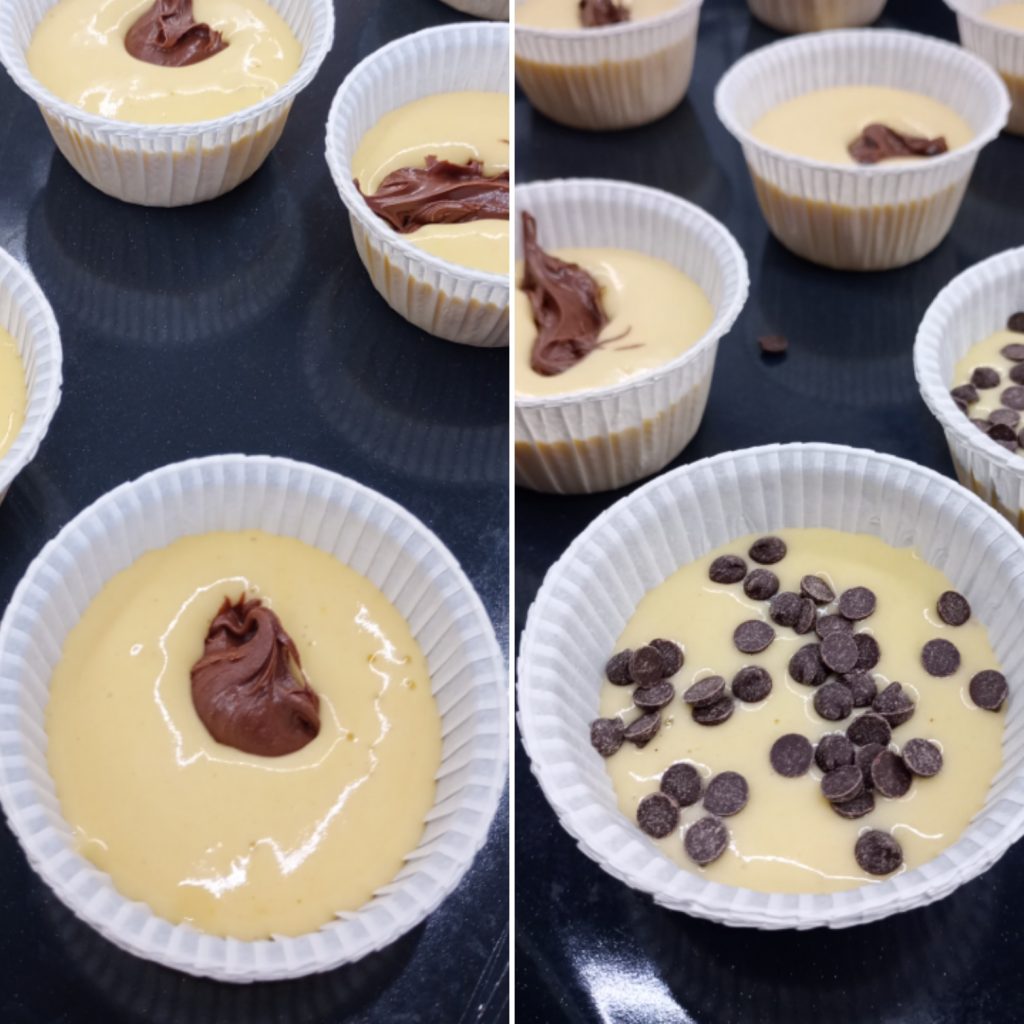 To make them even more inviting, I decorated the muffins with dark chocolate chips on top, and I made some even more delicious by filling them with hazelnut cream.