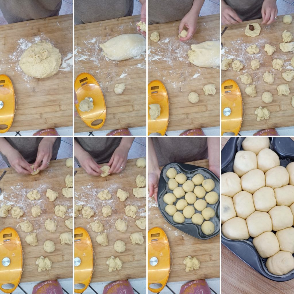 Take the edges and bring towards the center creating a ball and place on a buttered and floured pan (I used a dove-shaped mold, but if you don’t have one, arrange the balls in a row next to each other, starting from a row of one ball, then 2 balls, then 3 and so on to recreate the dove shape (see photo below)