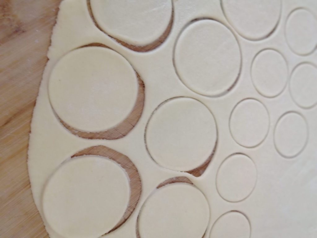 For the base dough create the discs: you’ll need a glass or a pastry cutter of 4 inches. For the cover disc you’ll need a glass or a pastry cutter of 2.75 inches.