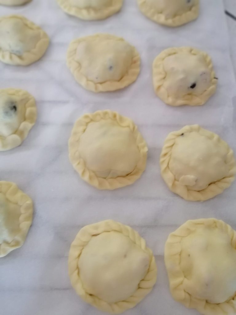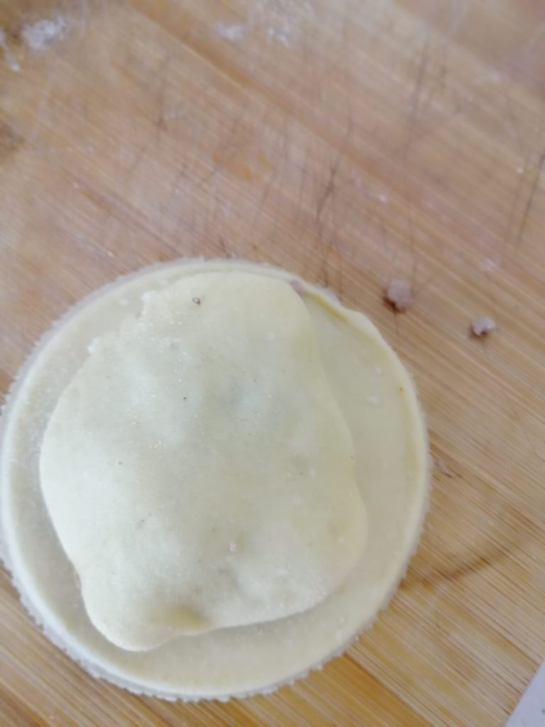 Take the large disc and place the meat and olive mixture in the center. Place the small disc on top and start to pinch the edges inward to securely seal.