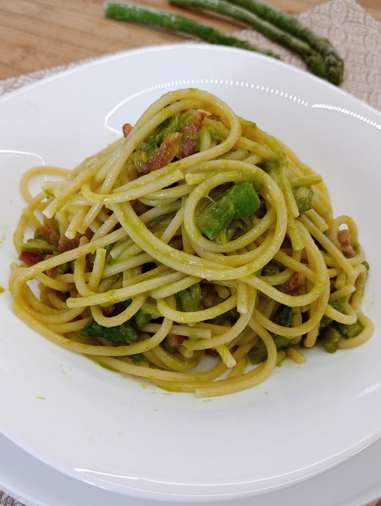 The pasta with asparagus and guanciale is a simple and very tasty first course. A very quick dish to prepare, I added only a few ingredients so as not to cover the delicious flavor of the asparagus. I also made a very quick cream with half of the asparagus and a tablespoon of pecorino to add creaminess.