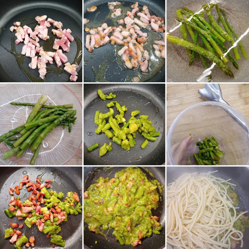 Once the cream is obtained, pour it into the pan where the guanciale was cooked and mix with the asparagus pieces, until combined.