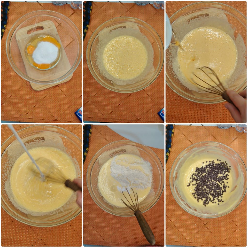 • Using electric beaters, whip the eggs and granulated sugar for about 3 minutes. At this point, switch to a hand whisk (to avoid deflating the mixture too much) and fold in the milk, the oil, the flour and the baking powder.