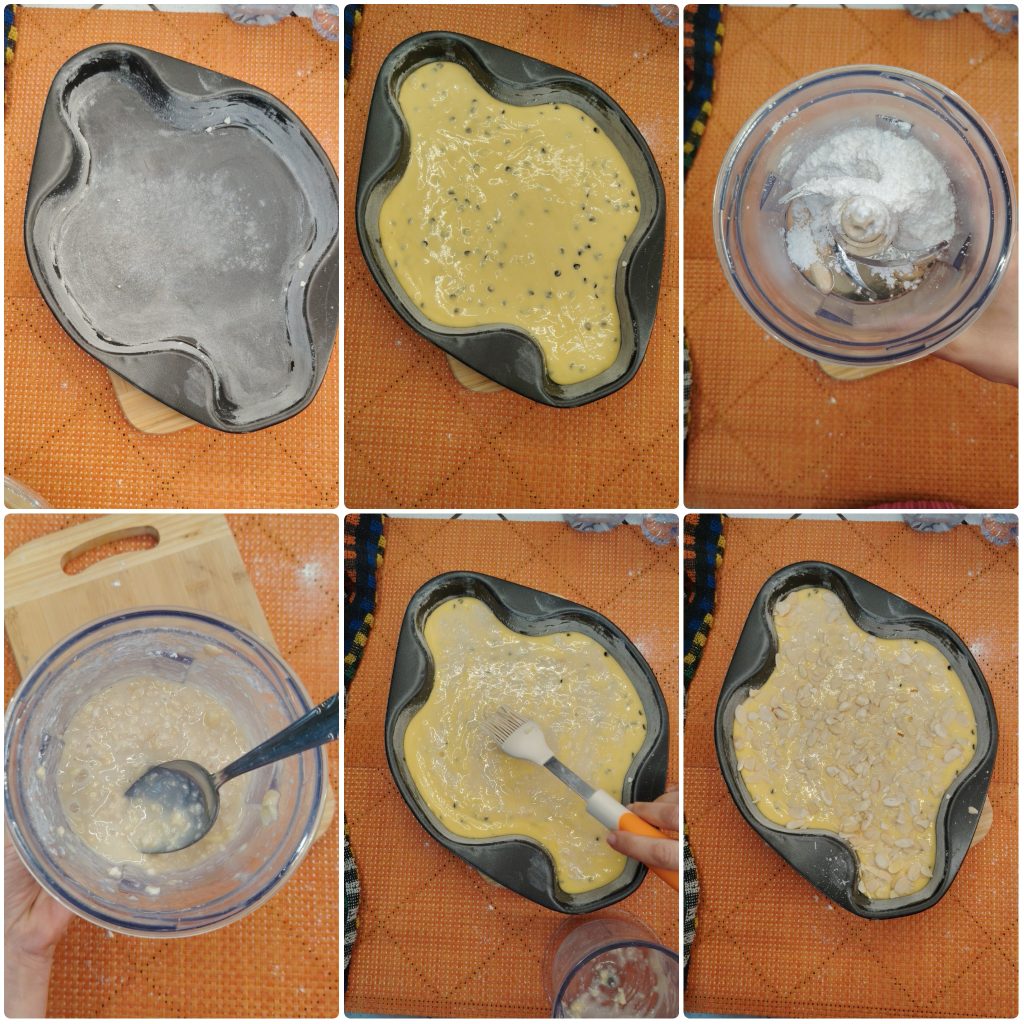 For the topping, prepare the glaze: grind the almonds in a food processor (choose the coarseness you prefer; I like them very finely ground) then mix them with the egg white and the powdered sugar.