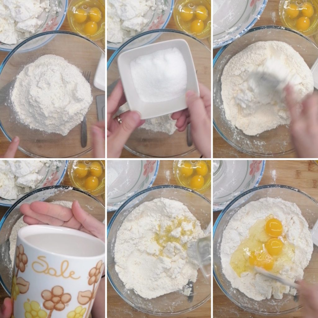 In a large bowl, pour the flour, the baking powder, the sugar and ricotta and mix with a fork.