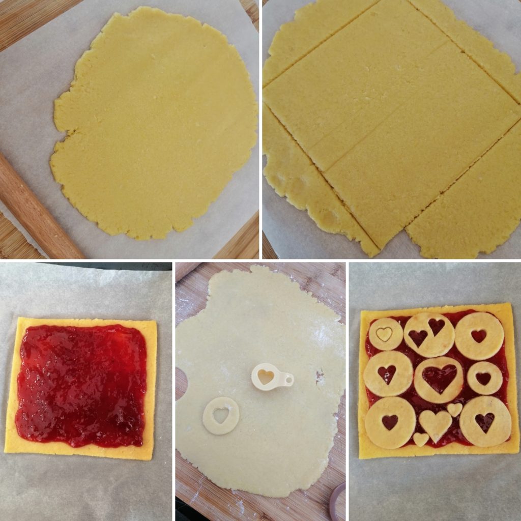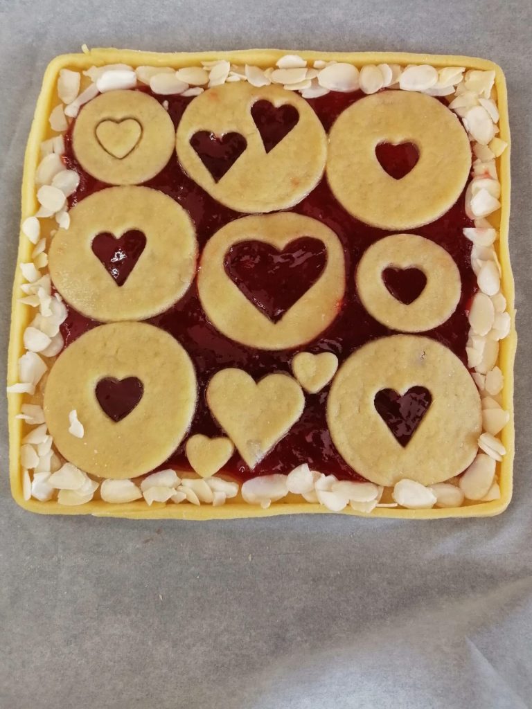 Do not roll too thin, form a square with the help of a knife (or your preferred shape), remove the trimmed edges, place the jam on top, and spread well. Roll out the leftovers of the shortcrust, create circles with a glass or a cutter, and create hearts inside. Place on top of the jam.