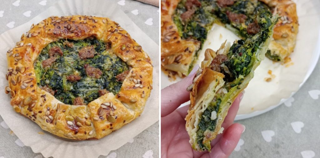For this version, I used a gluten-free puff pastry, but the beauty of this recipe is that you can customize it as you like. Feel free to use the classic puff pastry found in supermarkets or, if you want a more rustic and light touch, you can prepare my crazy dough: in any case, the result will be a guaranteed success! It’s the perfect idea to serve as an appetizer, for an aperitif with friends, or as a delicious main dish. Come with me, let’s start cooking. Enjoy the recipe, Giusi.