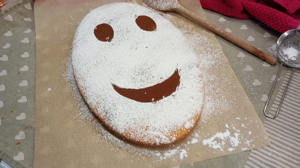 Once ready, let the cake cool completely inside the pan before removing it. For decoration, draw two eyes and a mouth on a sheet of paper, cut them out and place them on the surface of the cake. Dust generously with powdered sugar and, finally, gently remove the paper shapes.