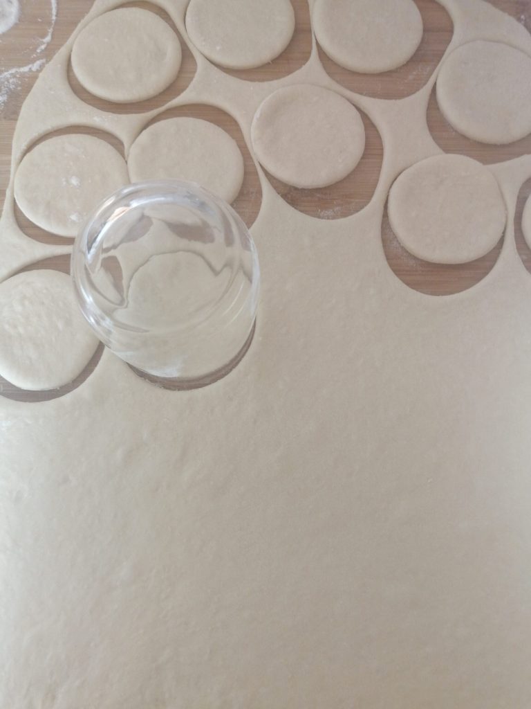 After two hours, roll out the dough on a floured surface and cut out the flatbreads using a glass or a cookie cutter.