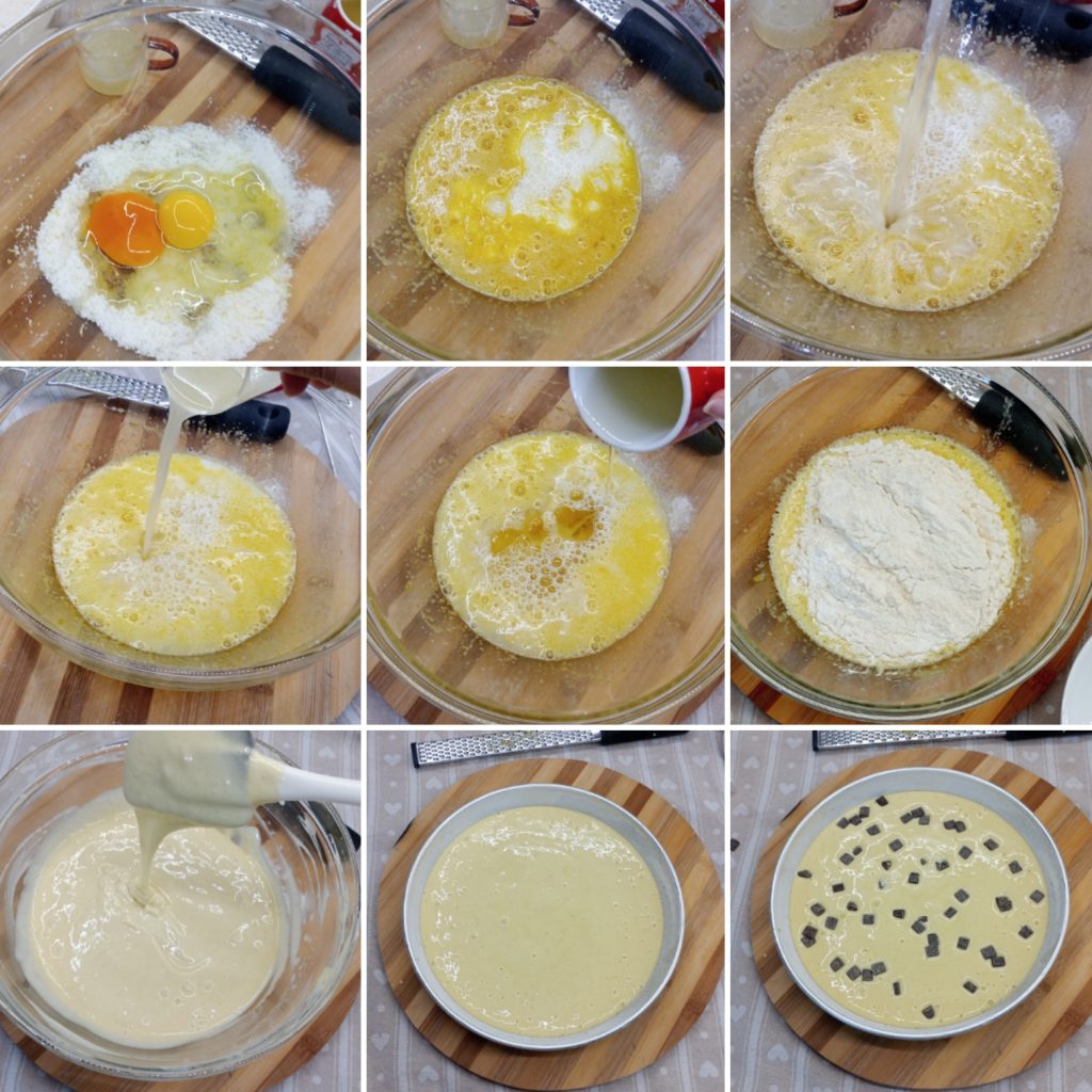 Quickly combine all the ingredients until the mixture is smooth and without traces of flour. No need to mix for too long.Pour everything into a 9.5 inch pan that you have previously buttered and floured.