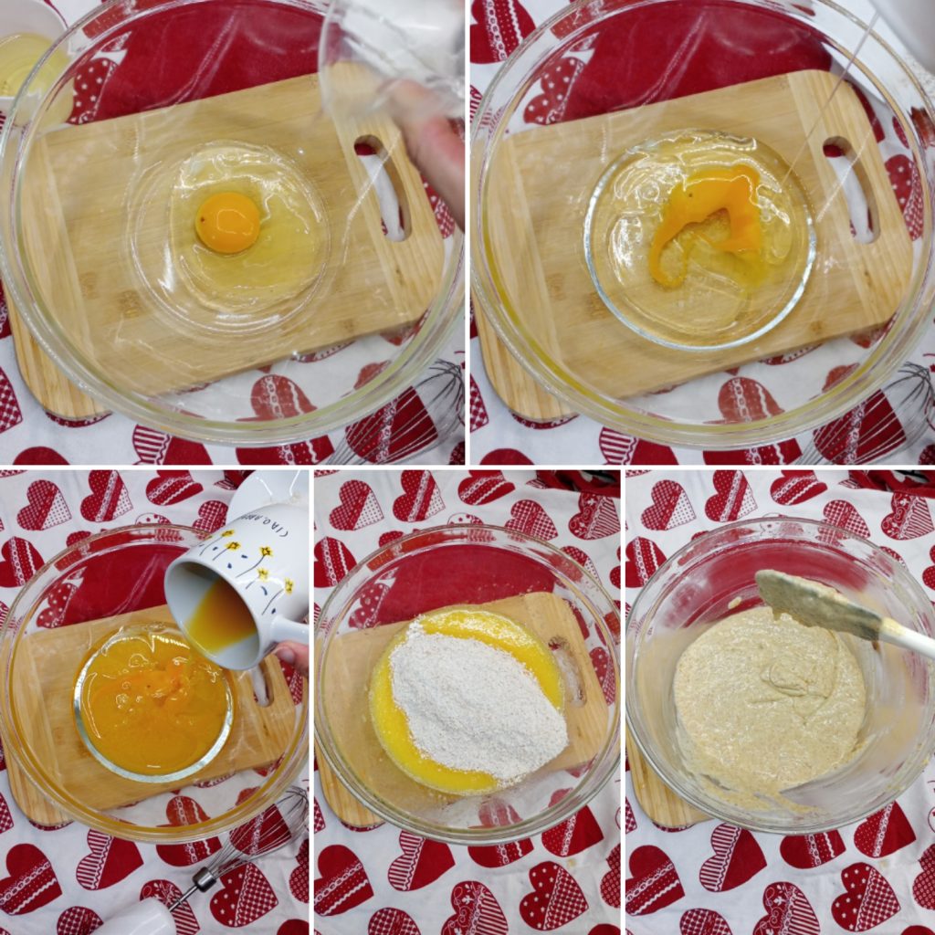 In a large bowl, whisk the egg with the oil and orange juice until well combined.