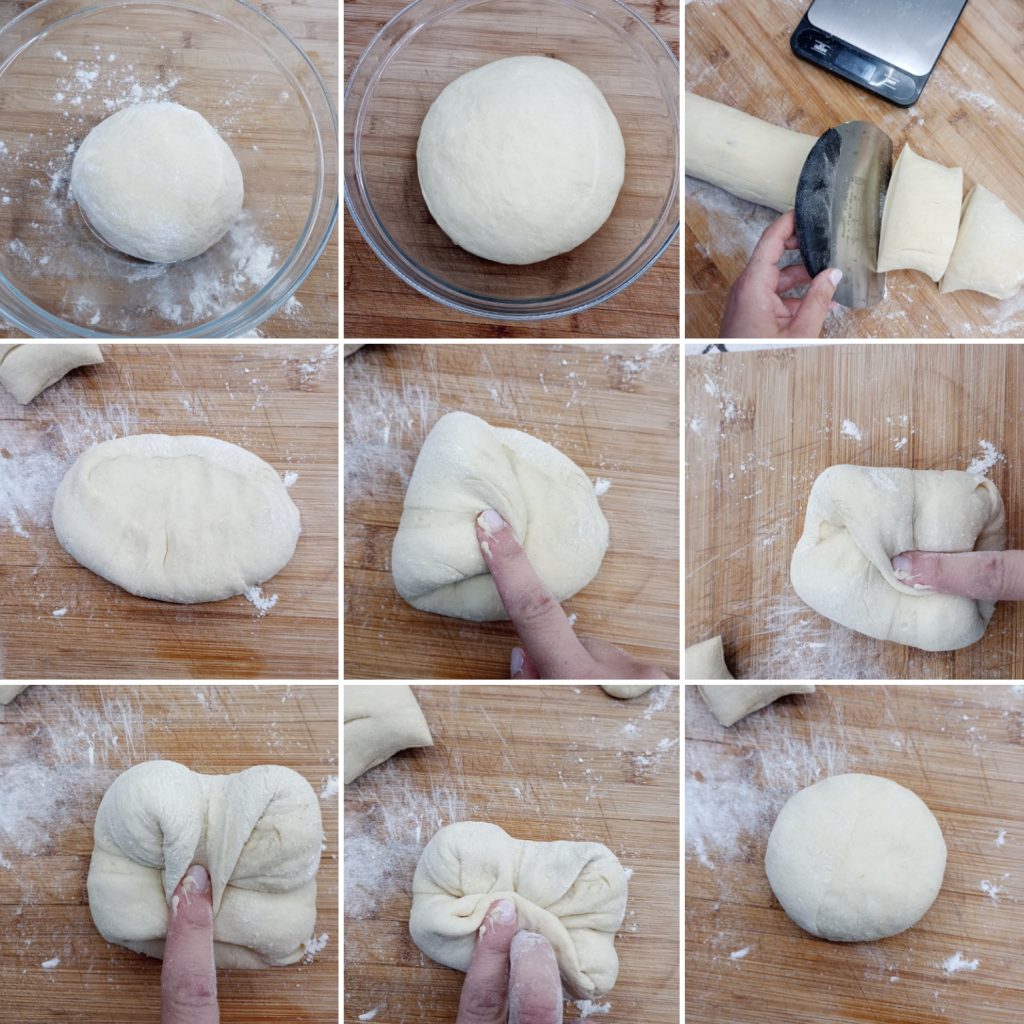 Turn the dough over, make a log about 18 inches long, and divide it into 6 portions of about 5 oz each.