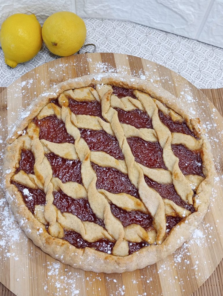 Place and level the marmalade inside and with the remaining dough create strips. I twisted the strips, pressed them slightly, and then placed them on top. Lower the edges of the tart inward.