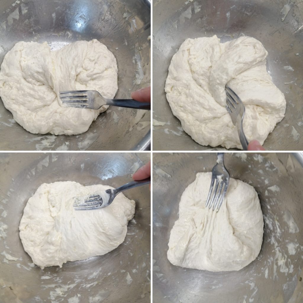 Repeat this sequence of “4 folds + 10 minutes rest” two more times. In total, you will do three series of folds and rests.