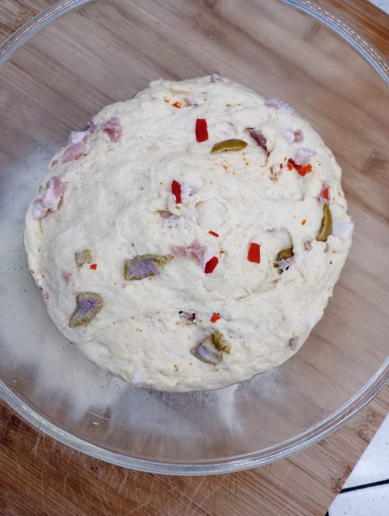 In a bowl, mix the two flours and the yeast, start adding the water slowly. After finishing with the water, also add the oil and finally the salt. Work for a few minutes until all ingredients are well combined, then add the chopped olives and bacon cubes. Incorporate these last two ingredients well, once ready, place in a well-oiled bowl, cover with plastic wrap, and let rise for at least three hours.