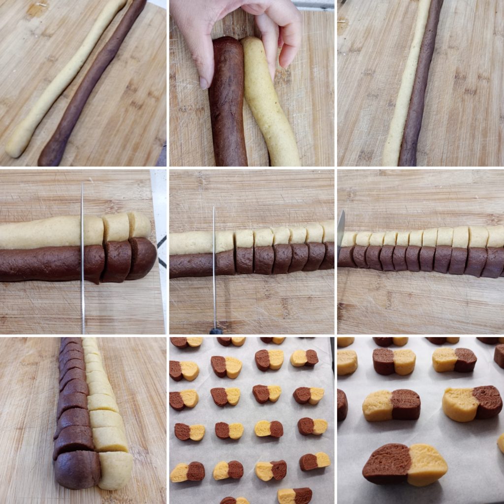 The secret to their two-tone effect is very easy: once the dough is made, just divide it into two parts and add cocoa to one part. Create two logs, join them together… and you’re done.