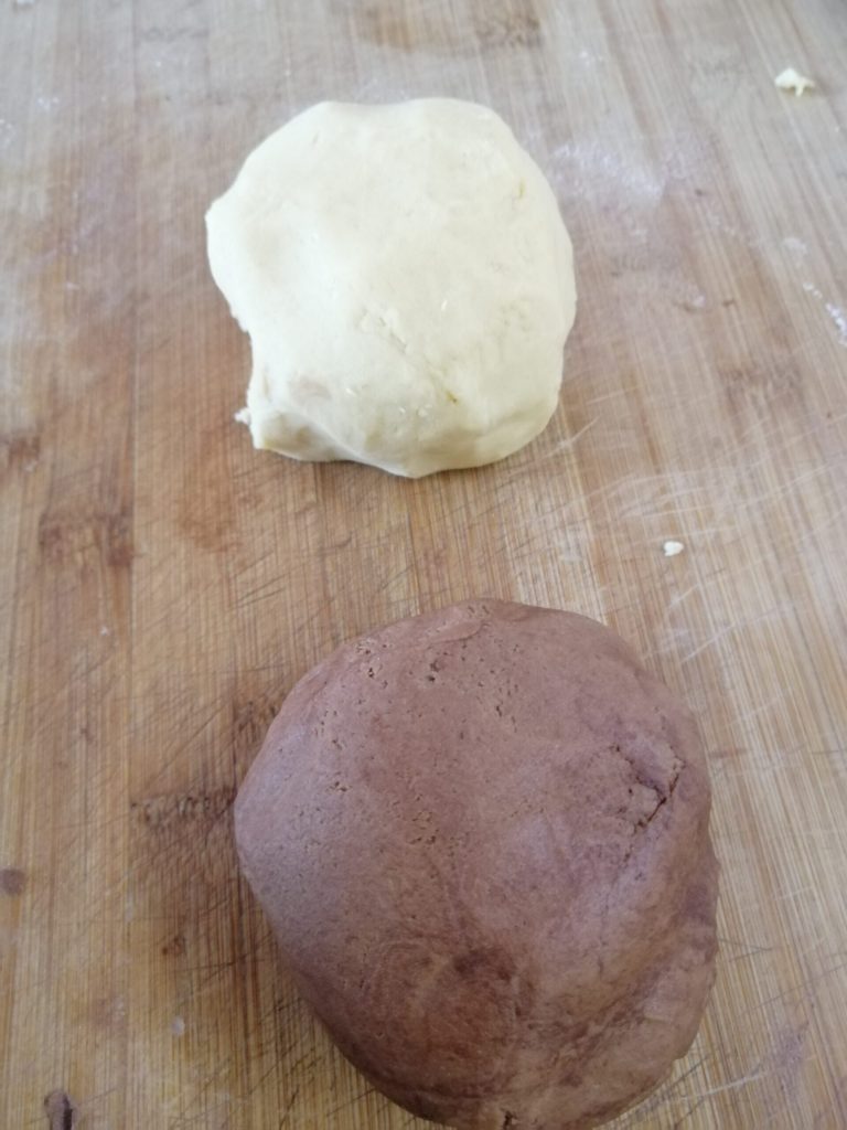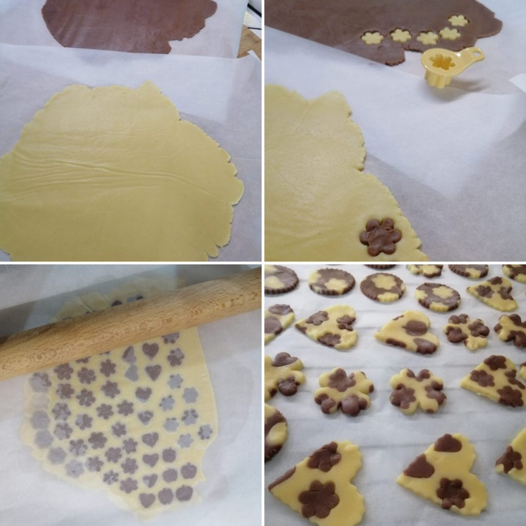 After this time, roll out the doughs between two sheets of parchment paper, so as not to add more flour. Take the molds and start making with small stamps or you can use a bottle cap to create the small pieces that we will then invert with the opposite color, as you see in the photos. Once finished, take a parchment paper sheet, lay it on the rolled out dough, and lightly roll over it with a rolling pin.