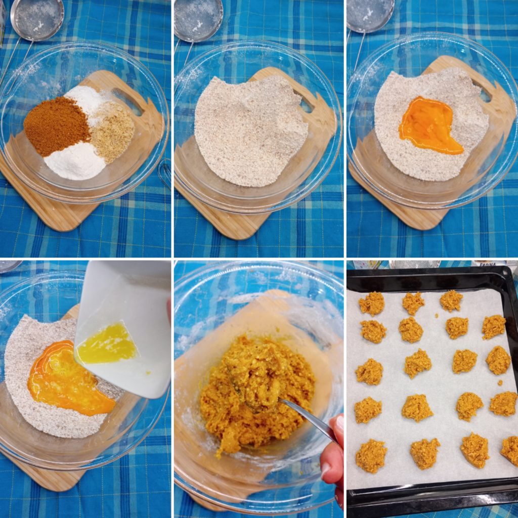 Do not worry if the mix is not compact: it’s entirely normal for it to remain a bit grainy and soft.Use two teaspoons to scoop some batter and form small mounds directly on a baking sheet with parchment paper, keeping them slightly apart.