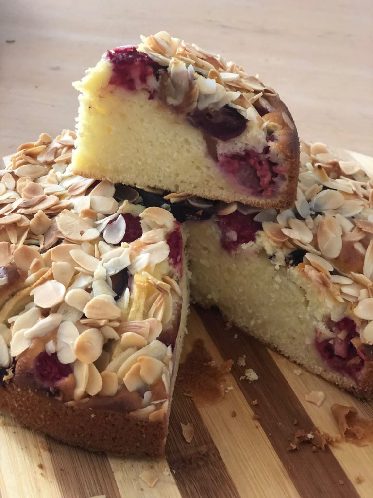 The vanilla-flavored cake has an amazing taste and is incredibly soft, while the fruit and almonds make it perfect.