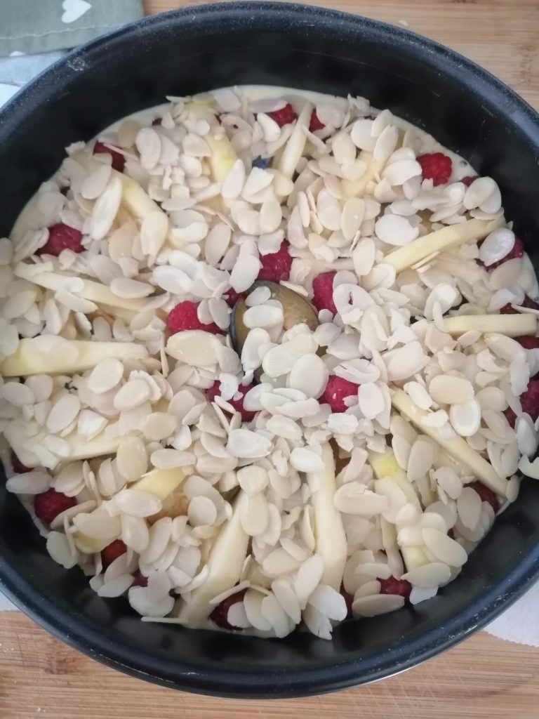 The vanilla cake with fruit and almonds is ready to be enjoyed.