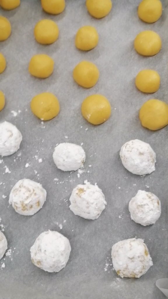 They are very simple to prepare; the only precaution you must take is to let the dough rest in the refrigerator for at least 1 hour. This step is essential for the perfect outcome of the little cookies. I chose to make half of the cookies with a powdered sugar coating. If you want to follow this version, I suggest reducing the amount of sugar in the dough by about 1 1/2 tablespoons (as I did), otherwise they may become too sweet. Decide according to your personal taste.