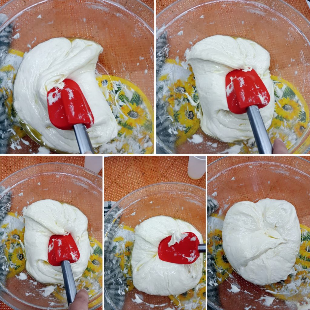 Repeat this operation (folds + 10-minute rest) two more times, for a total of three times.Once the cycle of rests and folds is complete, cover the bowl with cling wrap and let it rise at room temperature for about 3 hours.