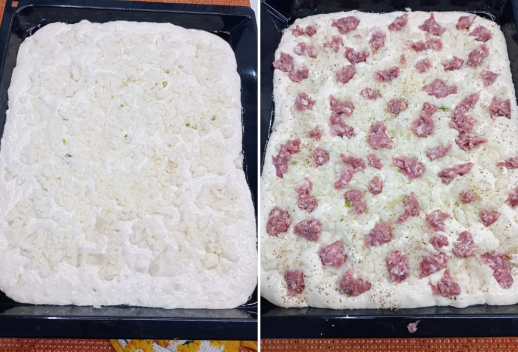 After the second resting time, remove the wrap and distribute the sausage (previously crumbled) evenly over the pizza.