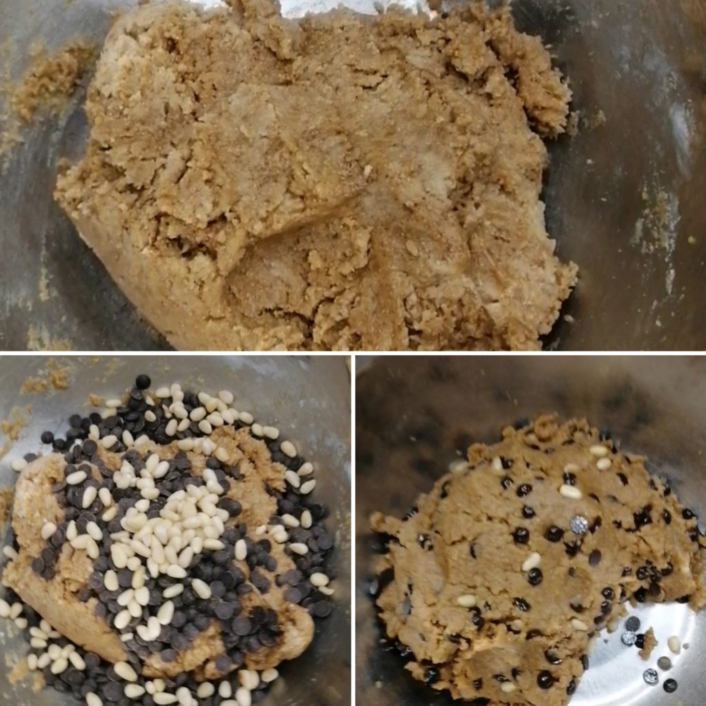 Add the chocolate chips and pine nuts and mix well until a dough is formed.