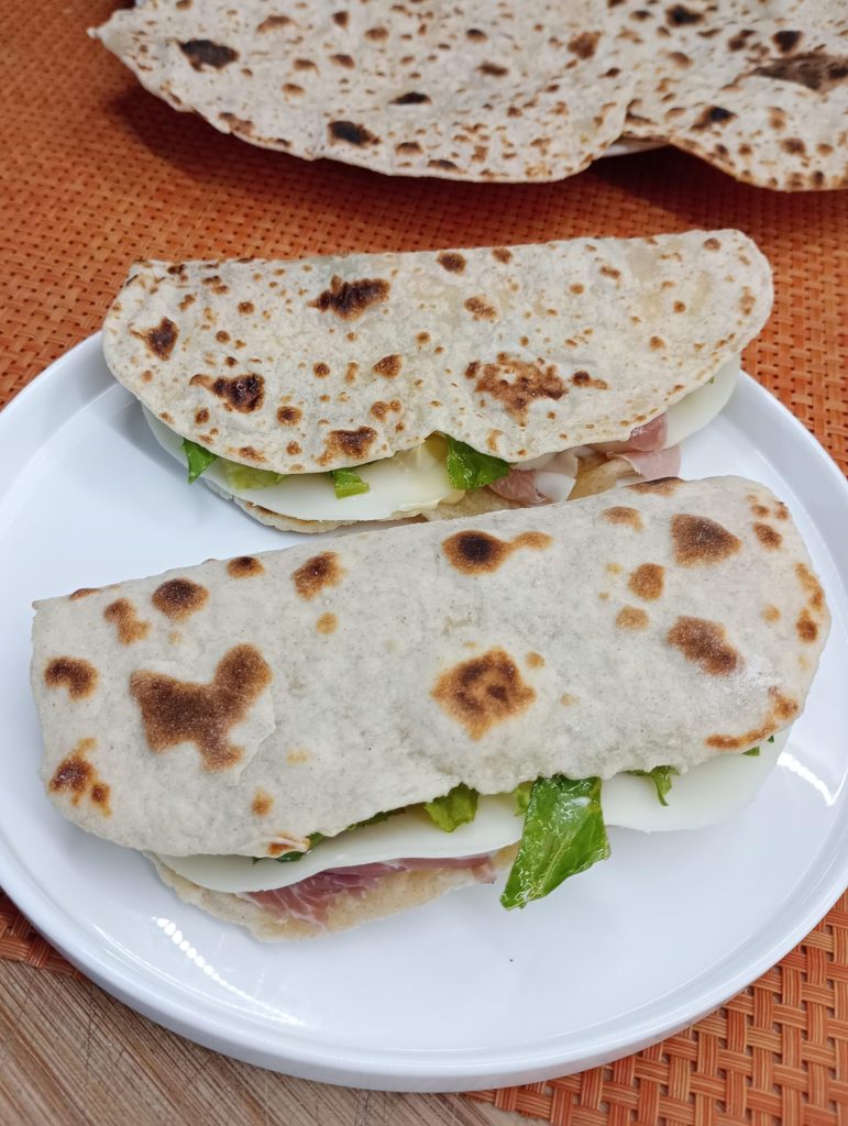 The yogurt flatbreads are ready to be enjoyed. I filled these delights with prosciutto, provolone, and lettuce, and others with stracchino cheese and arugula.