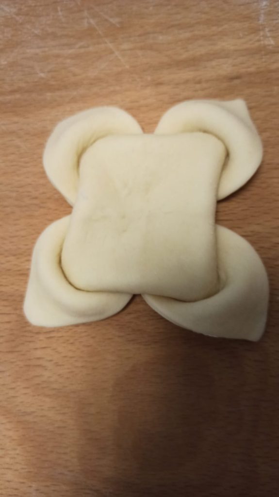 Turn over again. Slightly tighten the four sides to get leaf-like shapes. Press well in the center, otherwise the flowers will open during baking, and place half a candied cherry in the center.