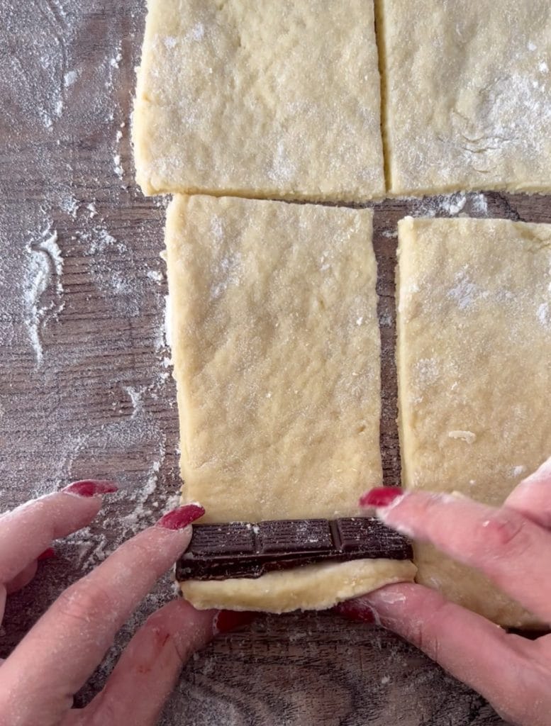 Place a second piece of chocolate and continue rolling to form the pastry.