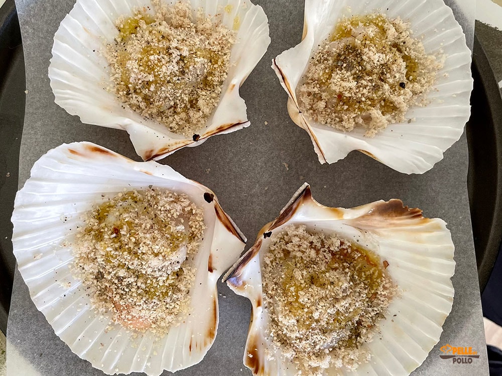 Place the scallops back in the shells (also washed and dried). Sprinkle them with the aromatic mixture and add another light drizzle of oil on top.