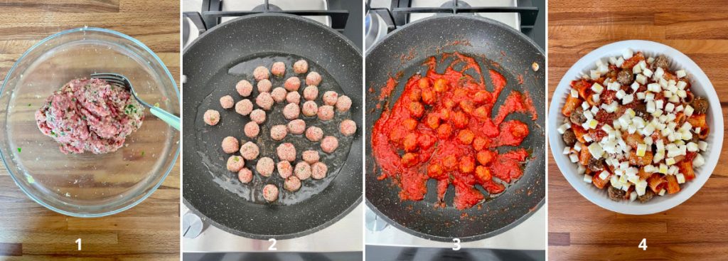 Transfer the pasta with meatballs to a large enough baking dish. Add the mozzarella, a sprinkle of grana, a pinch of pepper, and a drizzle of oil (4).